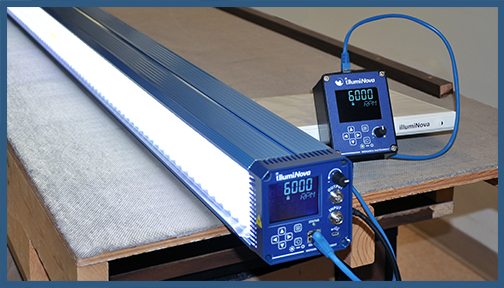 Yes! The INPUT connector (Aviation Plug M12 x 5) has 5 pins for connection of external trigger sources. These input signals can drive the strobe in the External Mode. The sensor input is compatible with Monarch Instrument’s inductive, proximity and optical sensors. (Refer to the illumiNova Fixed Mount Stroboscope Installation Guide for details.) You can use an external TTL signal to trigger the strobe directly from a printing/coating machine that provides a synchronizing pulse illlumiNova and the flash will be synchronized with your equipment